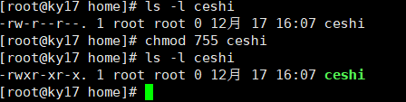 ?查看“ceshi”文件的权限(第一个“-”代表ceshi是个普通文件)