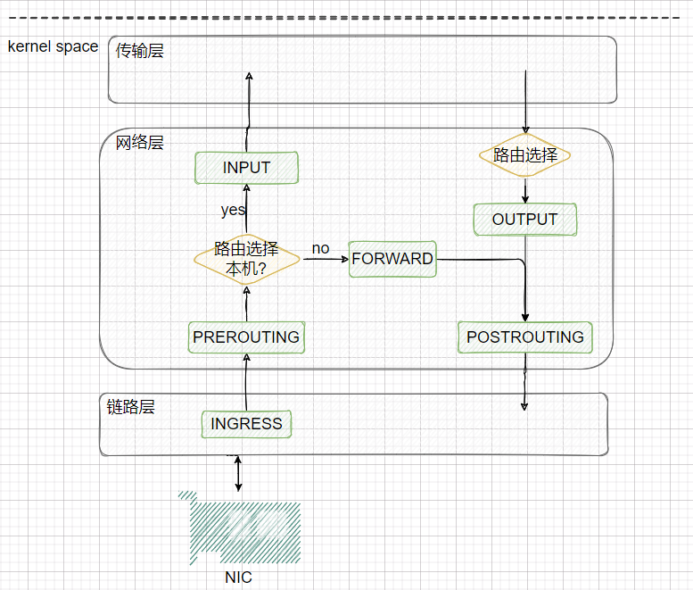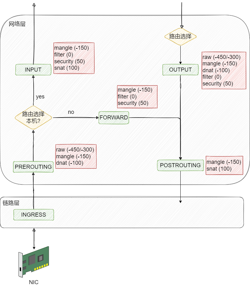 netfilter在网络层安装了5个钩子,对应5个链,还可以通过编写内核模块来扩展这5个链的功能。