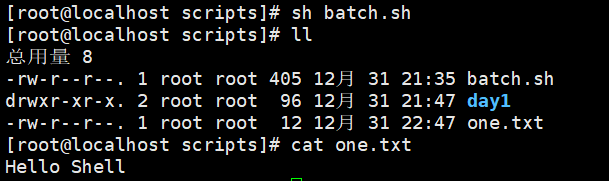 题目3:已知目录/scripts目录,执行batch.sh脚本,实现在/scripts目录下创建一个one.txt,在one.txt文件中增加内容“Hello Shell”