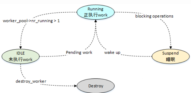 ????????1)worker_pool?通过?nr_running?字段来在不同的状态机之间进行切换; ????????2)worker_pool?中有work需要处理时,需要至少保证有一个运行状态的worker,当nr_running大于1时,将多余的worker进入IDLE状态,没有work需要处理时,所有的worker都会进入IDLE状态; ????????3)执行work时,如果回调函数阻塞运行,那么会让?worker?进入睡眠状态,此时调度器会进行判断是否需要唤醒另一个worker; ????????4)IDLE状态的worker?都存放在idle_list链表中,如果空闲时间超过了300秒,则会将其进行销毁;