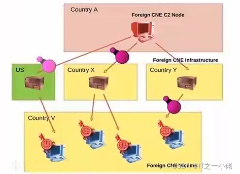 ????????如下图所示,情报收集方通过拿下攻击组织位于US、国家X、Y的行动基础设施以及国家A 的C&C,从这些主机上收集需要的情报数据。