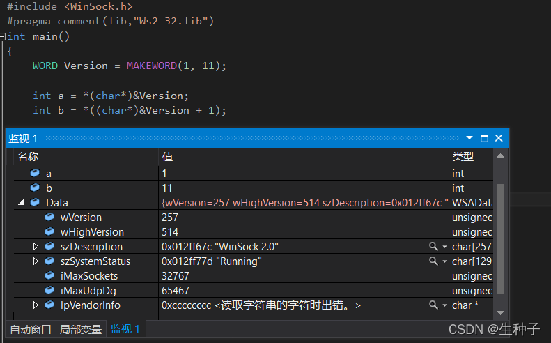 int ret=WSAStartup(Version, &Data);//返回值为一个int类型的变量