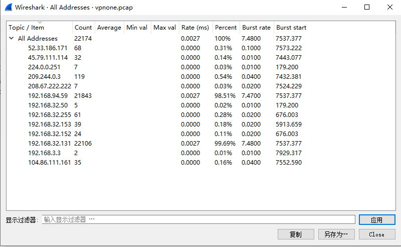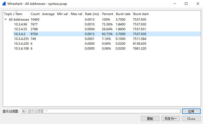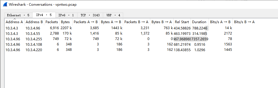 方法二: 首先统计vpnone,发现其中IP多为局域网内IP  发现vpntwo中出现了不一样的结果  其中出现的最为频繁的分别是10.3.4.96、10.3.4.55和10.3.4.3,然后我们在会话中可以看到10.3.4.96和10.3.4.3发出的包远远多于其他的IP  经过筛选以后发现10.3.4.96是sub服务器  然后再筛选另一个流量较大的IP(10.3.4.55),发现他只有两个包,而且是10.3.4.3首选in去PING它的,这里基本就可以确定10.3.4.3就是黑客VPN的IP了!