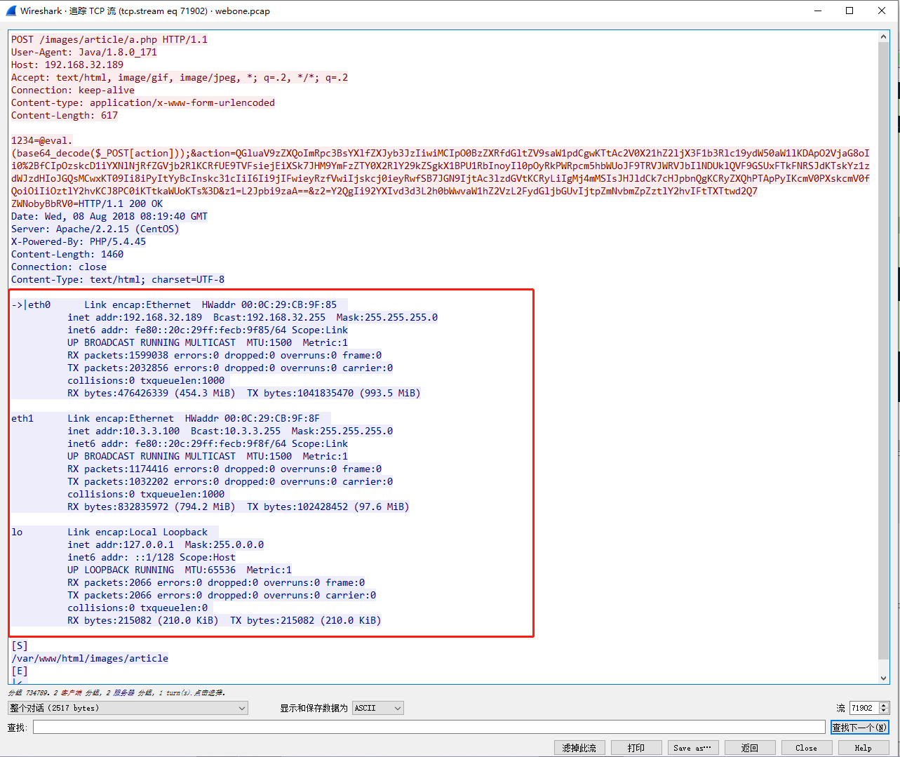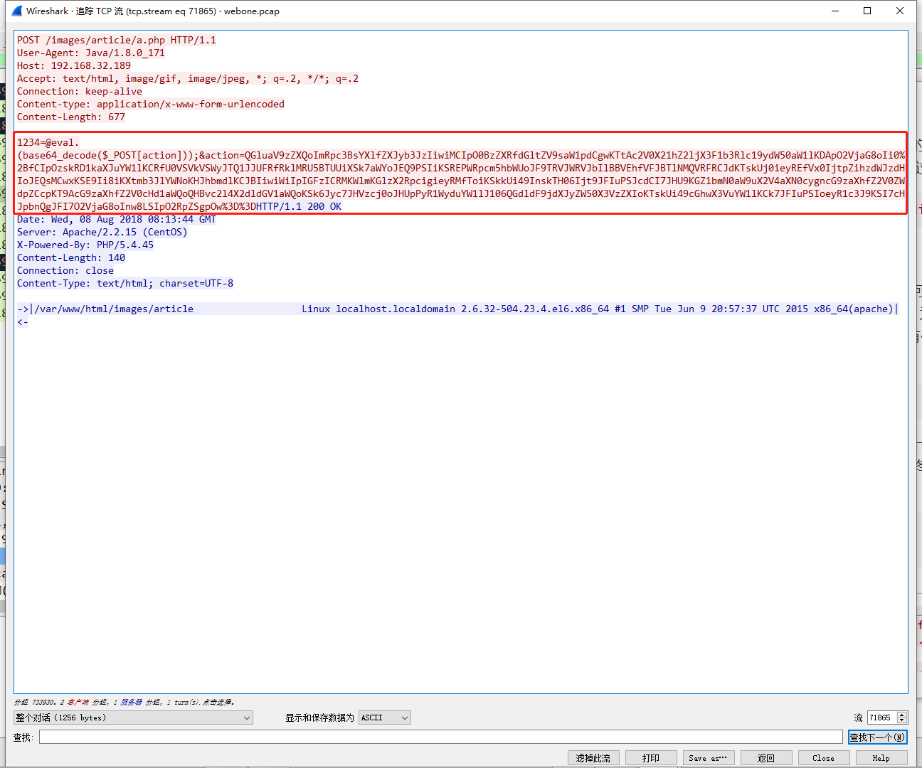 通过下面的语句过滤一下数据,翻阅数据包后发现了一个a.php可能有点蹊跷,但是没有发现他是如何上传的,不过追踪一下TCP流,发现1234为传递值,并有base64加密过的内容,解密一下发现是php代码,以z1为传递值,z1也是使用了base64加密过的内容,再次解密一下得到了一个目录。总结上面的东西发现好像并没有什么作用…
