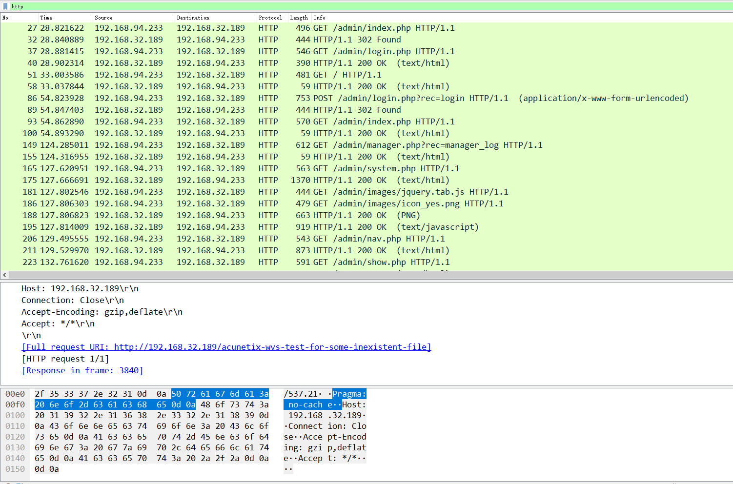 打开webone.pcap数据包,按照协议类型排序一下,看到http协议的时候,发现了明显的awvs的特征 打开webone.pcap数据包 ,过滤后发现了很多awvs的特征,说明是用awvs进行扫描的