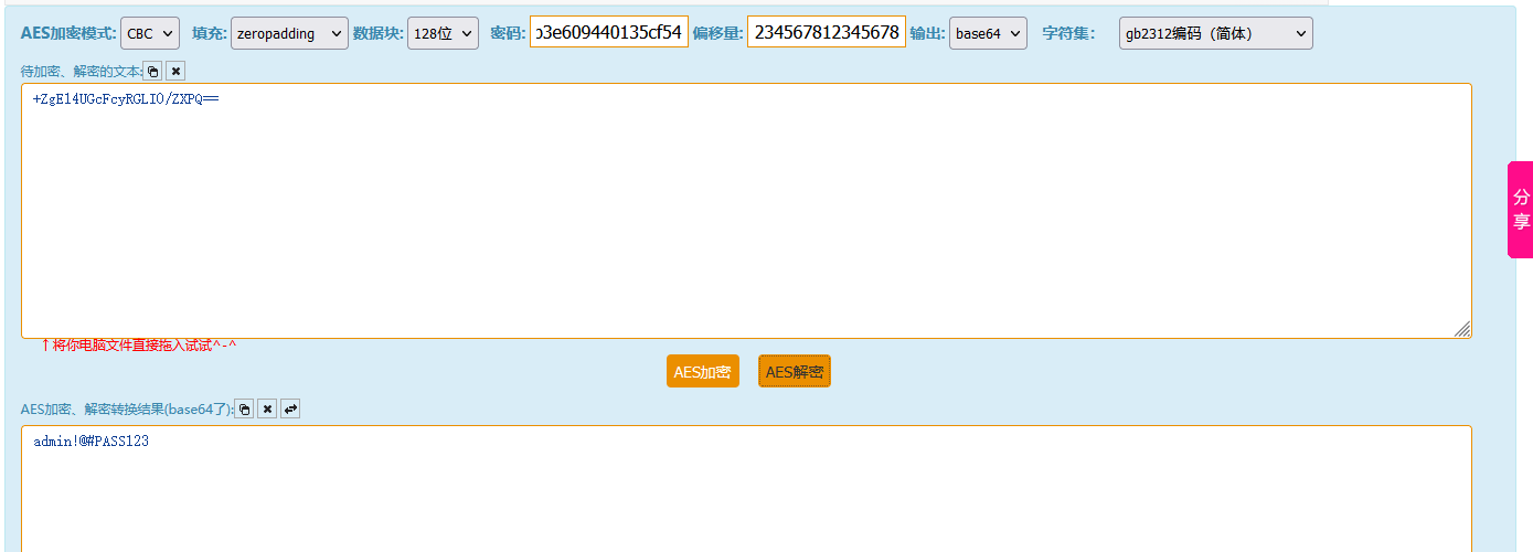 从后往前看,18152是登陆成功的返回结果,对应的17126则应该就是正确的加密后的密码  此时,我们已经知道了加密方式是AES iv偏移量为1234567812345678 (1234567812345678)经过md5加密后的key:d959caadac9b13dcb3e609440135cf54 登陆用户名是wenwenni 加密后的登录密码:+ZgE14UGcFcyRGLI0/ZXPQ==   aes解密工具:http://tool.chacuo.net/cryptaes