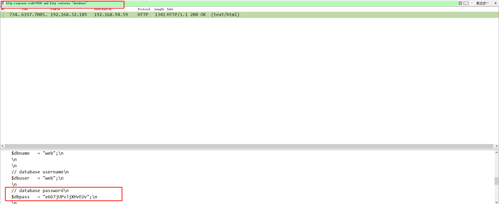 直接过滤http数据包,查看数据包的末尾,如果数据库登陆成功,那么http响应码应该为200,并且一般会包含database,逐一查看响应码为200的数据包,即可找到数据库密码