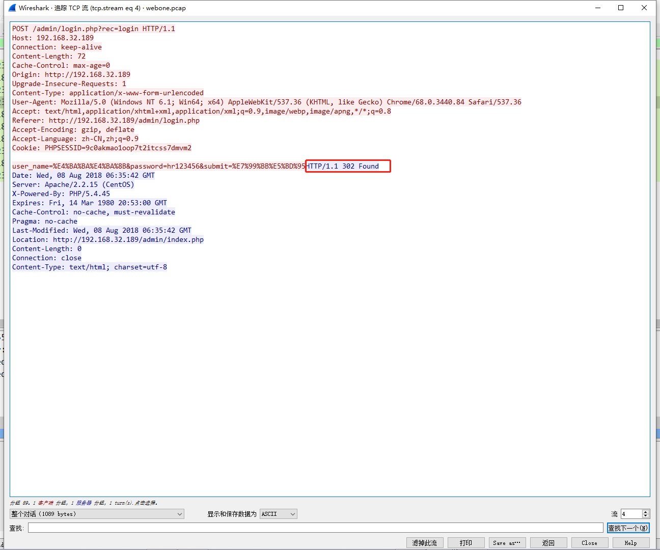追踪TCP流,出现302重定向的基本就是登录成功了