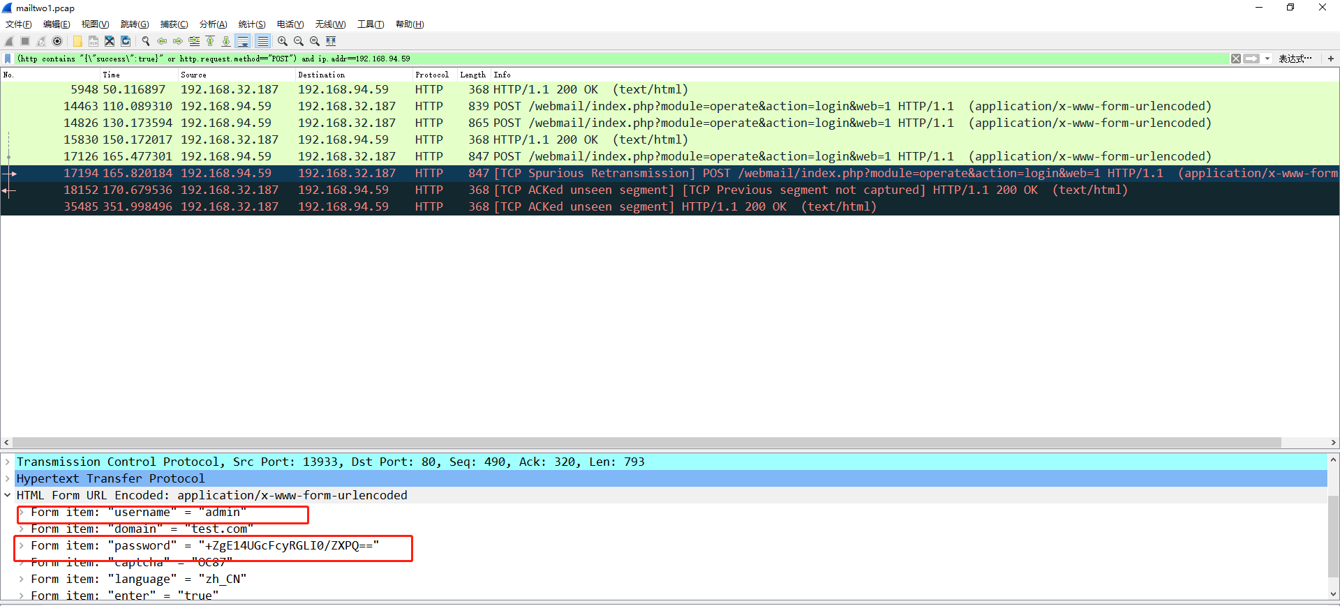 这题需要综合来看mailtwo.pcap和mailtwo1.pcap两个数据包。 先查询下mailtwo.pcap这个数据包,一开始利用POST和mail过滤了下