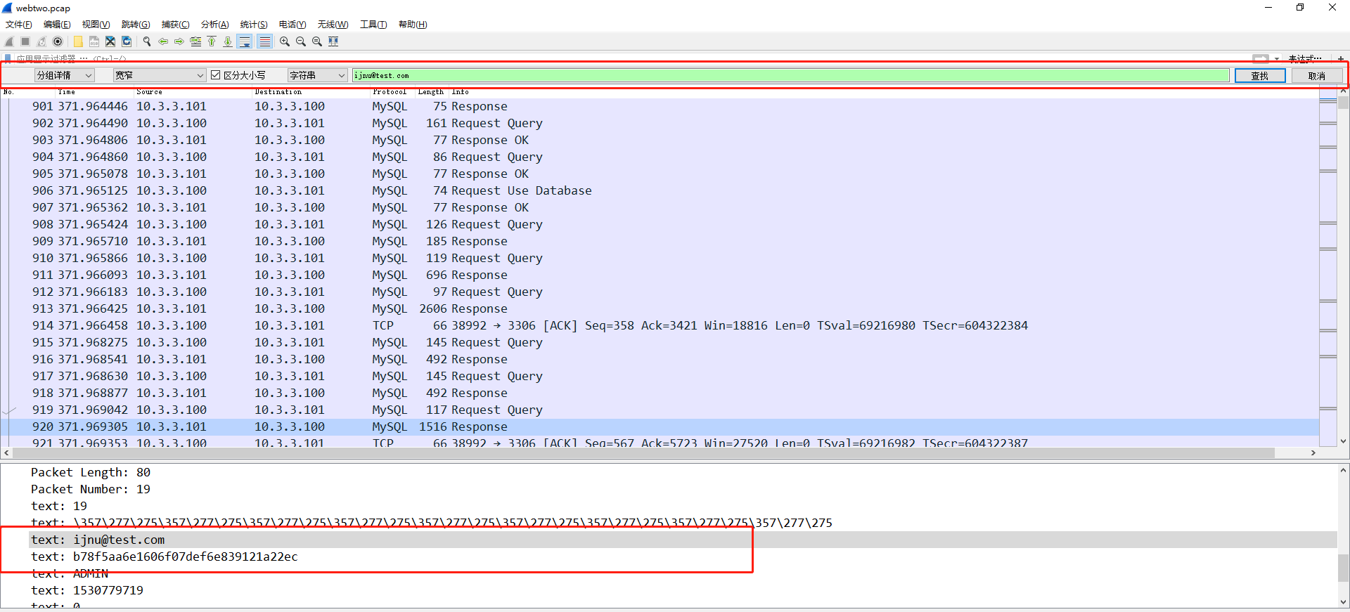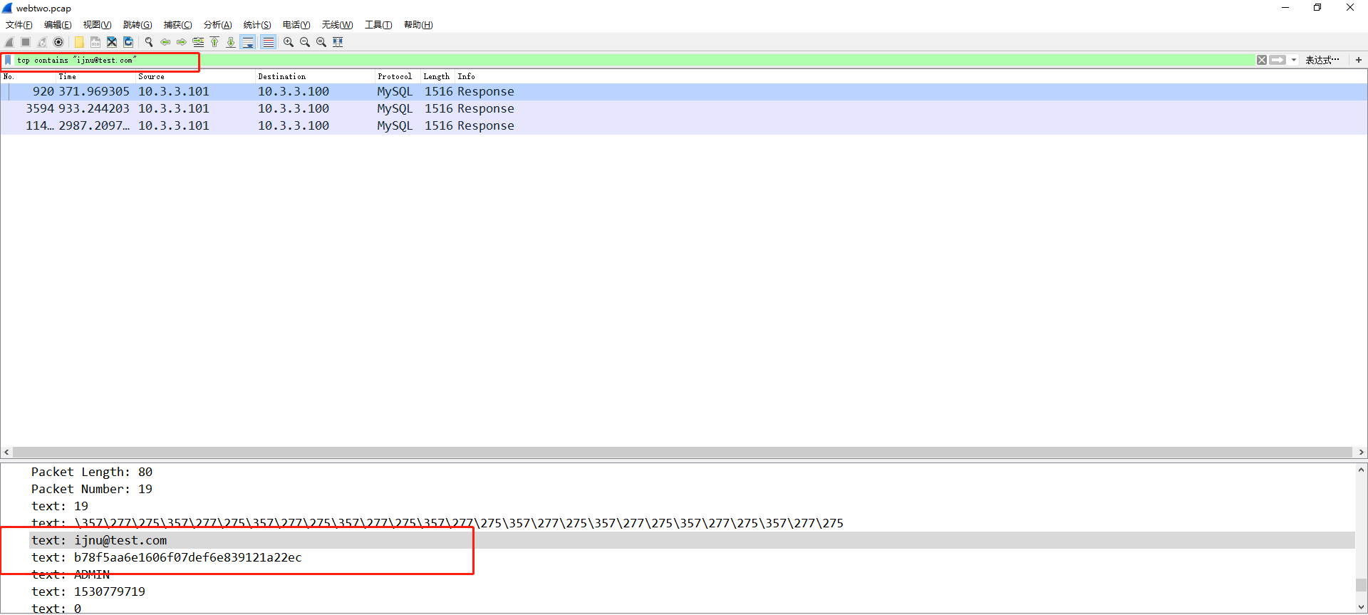 打开webtwo流量包, 可以先利用这个关键字查找一下,但是没有发现什么,既然还是关于数据库的,在上面我们已经知道数据库的主机是10.3.3.101,可以先查这个ip有什么数据。
