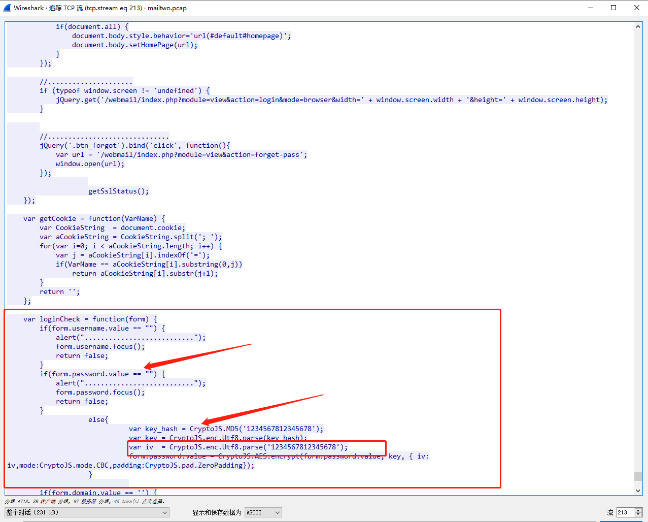 发现黑客进行大量的登陆尝试,随便找了一个密码,先看看是什么加密的  不是base64,应该是AES加密,但需要找到加密的密钥,所以还是得重新过滤在服务器返回的信息中去查找,就先只过滤一下http,随便找一个状态码为200的追踪下TCP流,在服务器返回的信息中发现  这是AES的CBC加密,填充格式为ZeroPadding,密钥为字符串1234567812345678的hash值,偏移量为1234567812345678 既然加密方式知道了,下面只需要找到正确的账号密码即可 在过滤了http后,发现第一条数据有logout,查看了一下Cookie信息,发现了登陆的用户名 在42号数据请求中,发现登录用户为wenwenni,再查看一下返回数据44号中出现{“success”:true},代表登陆成功。  然后使用以下过滤方法,发现mailtwo.pcap中都是爆破,最后也没有成功,同样的在mailtwo1.pcap中查询