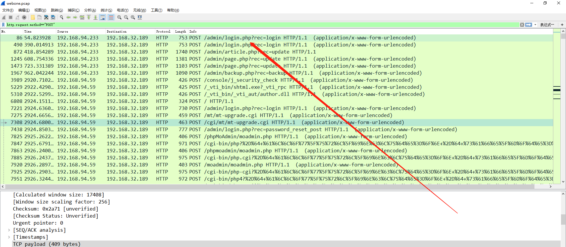 经过查看发现了很多出现302重定向的结果,于是发现了很多账号和密码,为了确定黑客使用的是哪一个账号密码,我们首先确定一下黑客使用的IP地址,刚刚看到使用awvs进行扫描的源地址一定就是黑客的ip。然后使用过滤器再次过滤一下。发现很多的尝试登录信息。