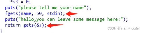 首先用安全的fgets输入了一个变量,接着用不安全的gets接收了一个变量,在此处可以确认是栈溢出,且溢出点就在此处。