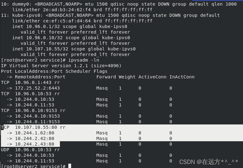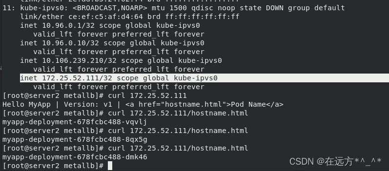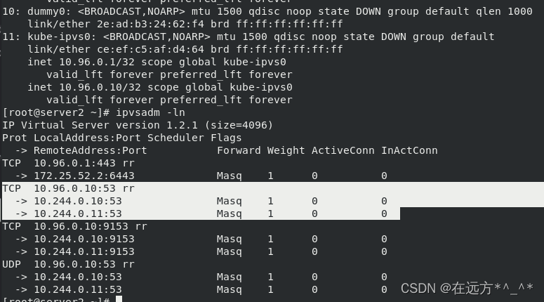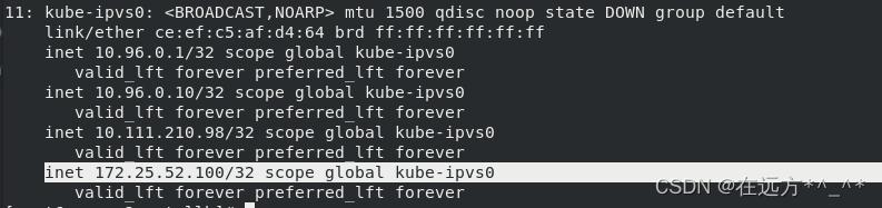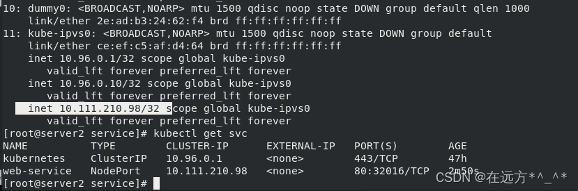 IPVS模式下,kube-proxy会在service创建后,在宿主机上添加一个虚拟网卡:kube-ipvs0,并分配service IP。 [root@server2 ~]# ip addr
