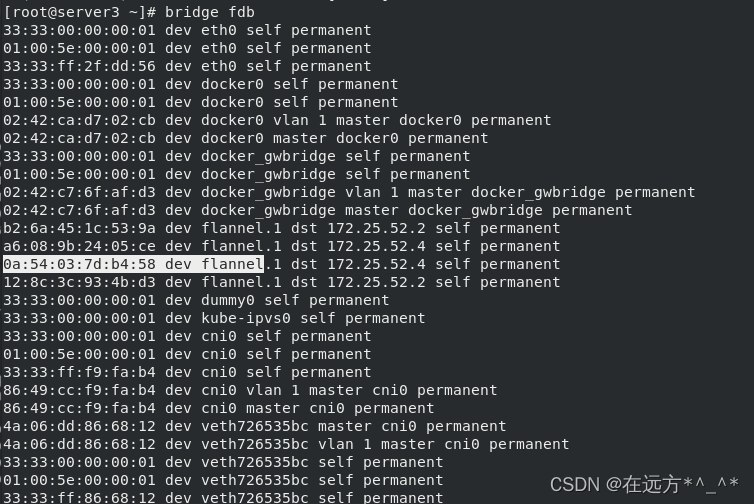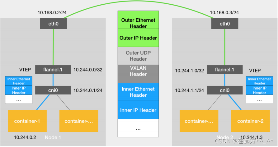 - VTEP: VXLAN Tunnel End Point (虚拟隧道端点),在Flannel中VNI的默认值是1,这也是为什么宿主机的VTEP设备都叫flannel.1的原因。
