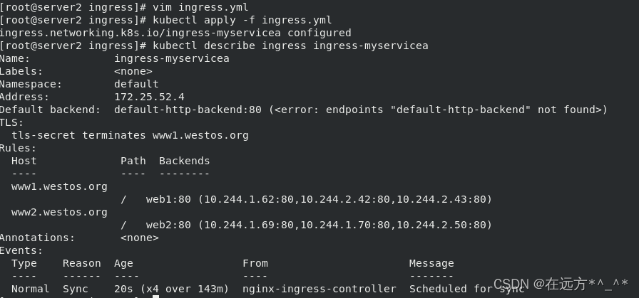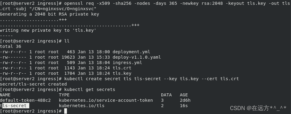[root@server2 ingress]# kubectl create secret tls tls-secret --key tls.key --cert tls.crt
