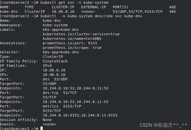 ?[root@server2 ~]# kubectl? -n kube-system describe svc kube-dns