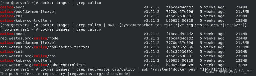 [root@server1 ~]# docker images | grep calico | awk '{system("docker tag "$1":"$2" reg.westos.org/"$1":"$2"")}'