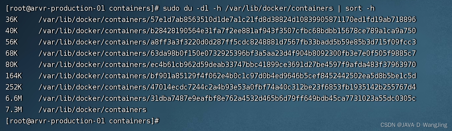 sudo du -d1 -h /var/lib/docker/containers | sort -h