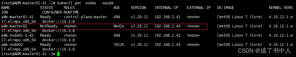adm-master02 NotReady <none> 6m42s v1.20.11 192.168.2.44 <none> CentOS Linux 7 (Core) 4.19.12-1.el7.elrepo.x86_64 docker://19.3.8