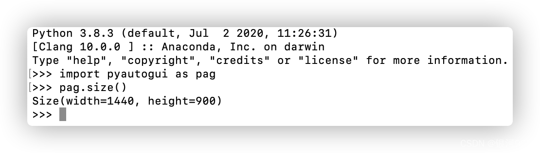 到这一步,locateCenterOnScreen 已经可以正常返回坐标了,就在我以为完事的时候,弥天大坑出现了😭。通过 pyautogui.moveTo(locateCenterOnScreen("fileName.png", confidence = 0.8)) 移动鼠标到对应的地方,我发现鼠标并不会如我所愿去到正确的位置,在这里倒腾了非常久,最后发现是 MacBook Air 的渲染分辨率和屏幕的实际分辨率不一样,不是点对点渲染的。我们使用 pyautogui.size() 方法查看屏幕的渲染分辨率,得到如下结果: