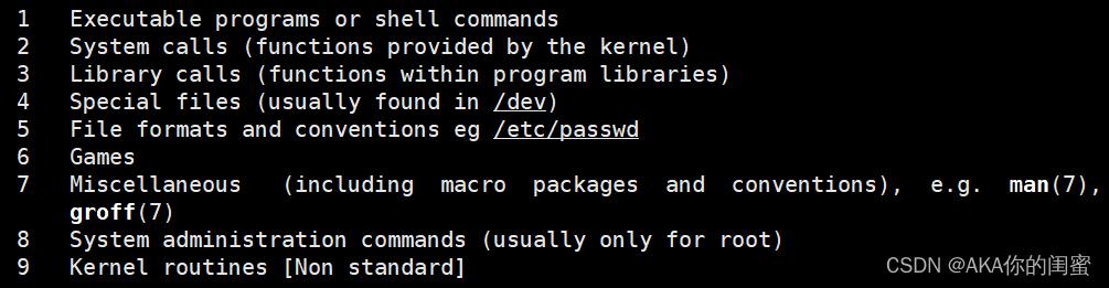 该手册共有9章,第一章是默认的命令,第二章是系统调用函数,第三章是库调用的函数,最常用的就是这三章。