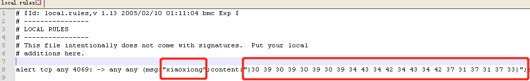 控制机中打开小熊远控配置器,配置上线地址为控制机IP,然后生成服务端  将生成的服务端在被控机中运行,小熊远控检测到被控机。  同时wireshark抓取到两者之间的通信,然后跟踪流信息,发现特征值。  在snort中的local.rules中配置规则 报警提示信息msg设为“xiaoxiong”,特征字段content设为上图中框出来的十六进制数,也可以直接用后面的字符串。  然后重复上述连接过程,打开数据库,发现报警信息xiaoxiong