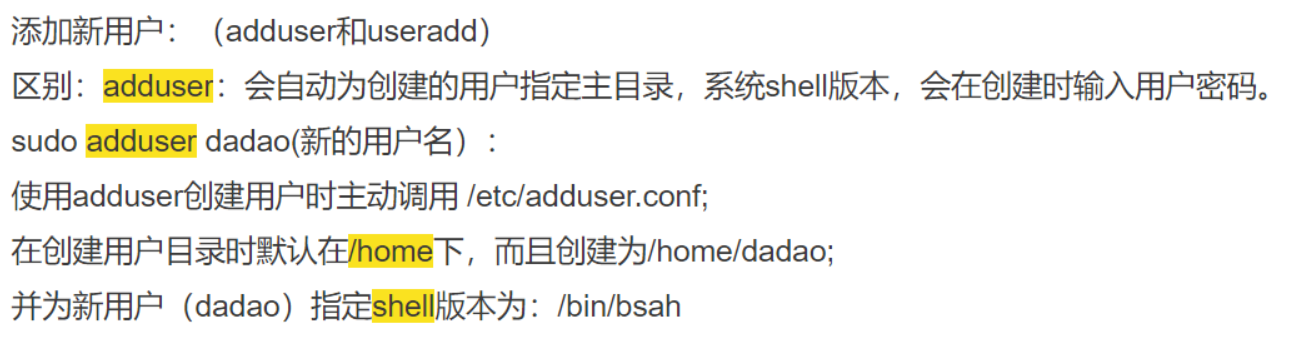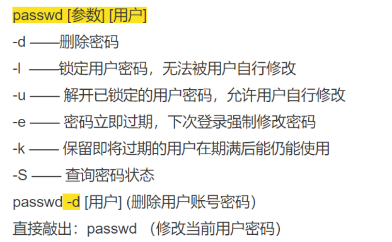 查看用户:cat /etc/passwd (所有的用户);tail /etc/passwd (查看后十行的用户) ** ** 删除用户:userdel userdel [参数] [用户名] userdel Linuxcol (删除用户,但不删除其目录及文件) -f —— 强制删除用户账号 -r —— 删除用户目录及其中的任何文件 -h —— 显示命令的帮助信息