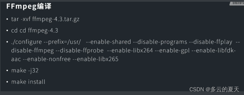 ./configure --prefix=/usr/ --enable-shared --disable-programs --disable-ffplay --disable-ffmpeg --disable-ffprobe --enable-libx264 --enable-gpl --enable-libfdk-aac --enable-nonfree --enable-libx265
