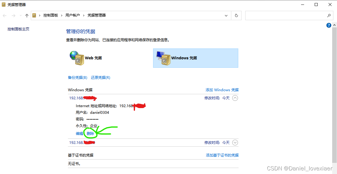 最后打开任务管理器查看两个网口的传输速度,发现usb拓展坞网口没有工作,怀疑是需要重新登一次 \\群晖ip,例群晖内网ip是192.168.1.10,则是\\192.168.1.10,在此之前需要删除之前登录群晖的网络凭据,如下图所示: