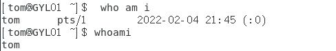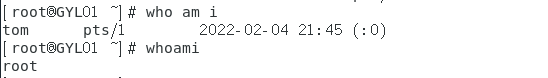?结论: ????????who am i 一直都是tom,说明它显示的是初始用户登录的用户名 ? ? ? ? whoami 第一次登录是tom第二次是root,说明它显示的是当前"操作用户"的用户名。 ?