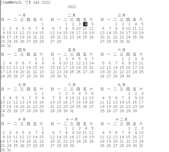 含义:显示当前月份的日历 "cal":显示当前月份的日历