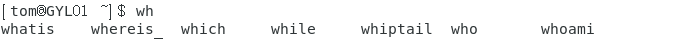 ????????? ?2.对于输入的几个字符,若有多个命令与之相对应,那么使用两次Tab键(一次Tab没反应),则系统会列出所有与之匹配的命令。 ? ? ? ? 输入wh,按两次Tab会出现