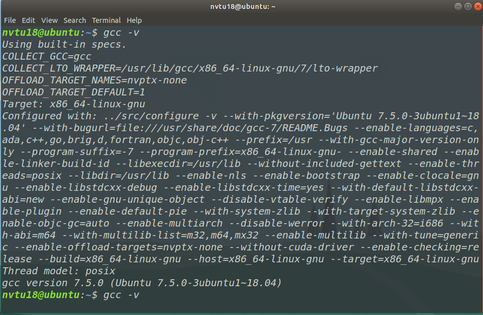虚拟机:VM Ware 14 ubuntu:18.04 LTS gcc版本:7.5.0 具体使用 gcc -v 命令查看如下图所示: