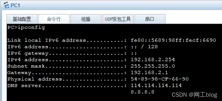 2)PC1/2/3/4/5/6都通过DHCP服务获取到地址,并且PC1/3在192.168.2.0 /24网段,PC2/4/5/6在192.168.1.0 /24网段,下面验证就仅放两个网段获取的地址情况