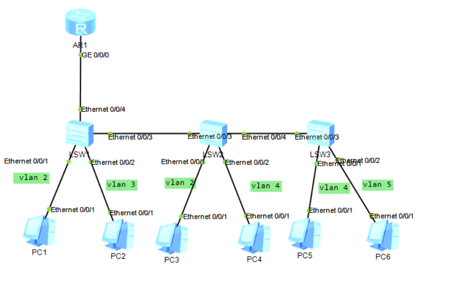 [sw1-Ethernet0/0/4]port hybrid untagged vlan 3 to 5
