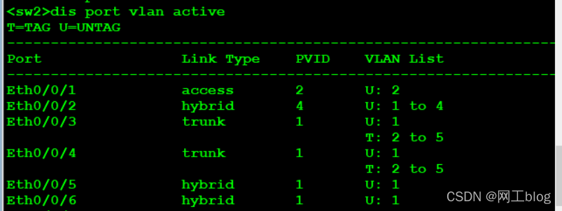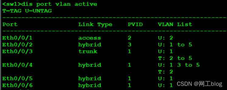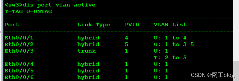 1)通过<sw>dis port vlan active 查看三台交换机的Link type(默认为hybrid )、PVID(默认为1) 、VLAN List 允许列表(PC端发送和接收不带标签的流量,U为untagged 不携带标签,T为tagged携带标签)