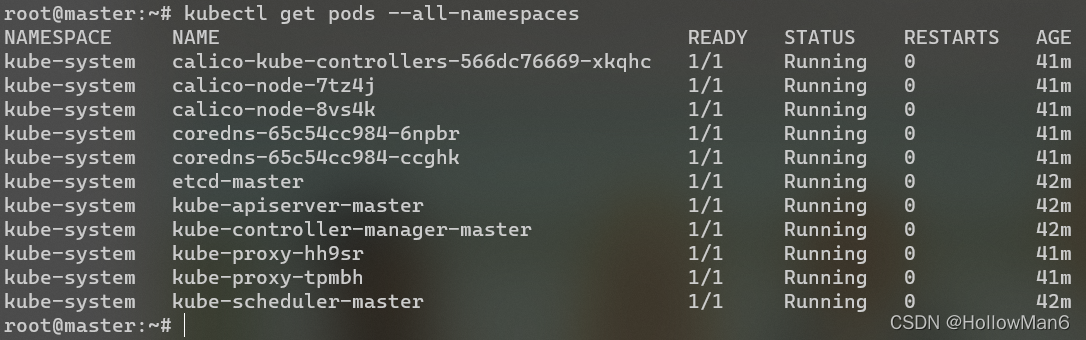 稍等片刻,所有节点都正常运行:(以下命令都在master中执行)kubectl get nodes  kubectl get pods --all-namespaces