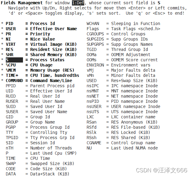 // 在此界面下,使用P 是以CPU的使用情况来进行排序的;M 使以内存的使用情况来进行排序;N 是以PID来进行排序显示;T 是以进程使用时间累计排序显示;k 给某个pid一个信号,用来杀死进程;r 给某个pid重新定制一个nice值(也就是我们常说的优先级);q 是用来退出top的交互模式
