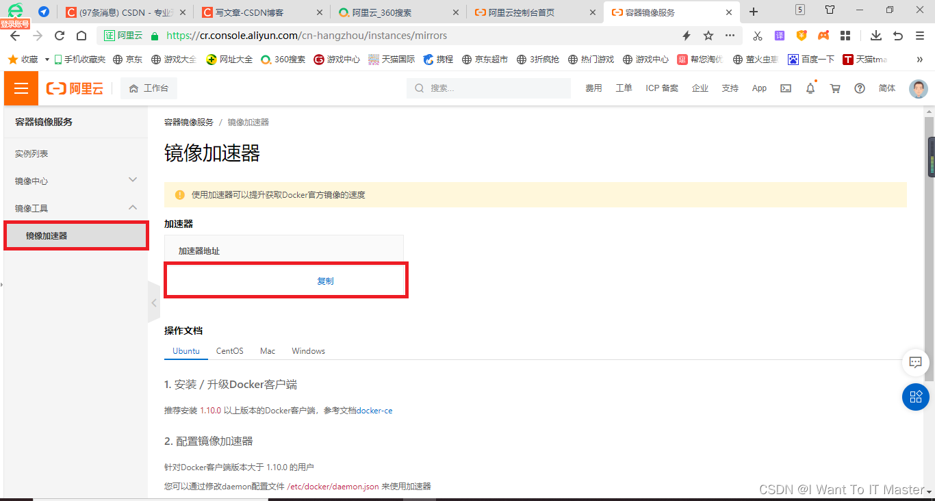 ?进入阿里云控制台,进入容器镜像服务,点击镜像加速器,然后复制加速器地址即可