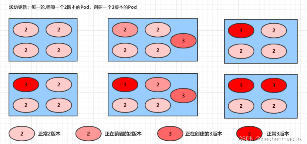 - Deployment:通过ReplicaSet来控制Pod,并支持滚动升级、回退版本