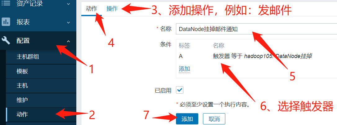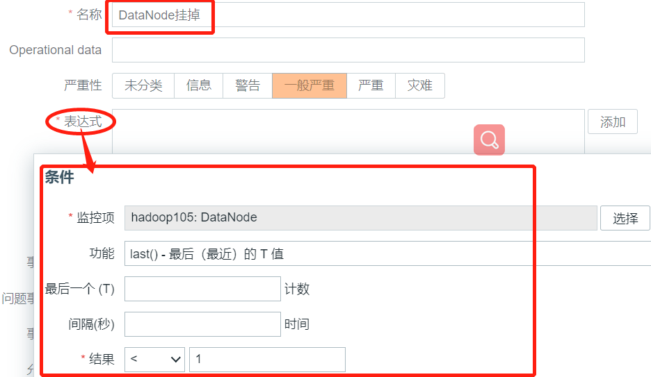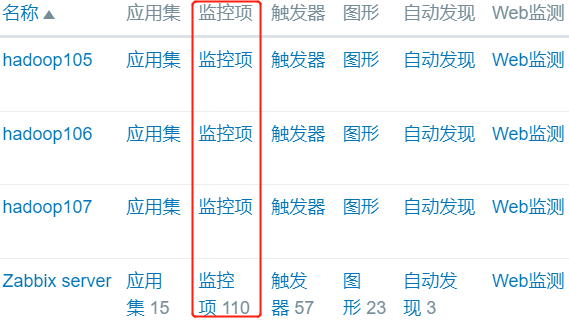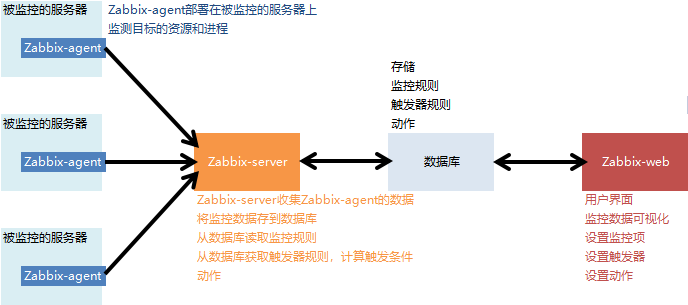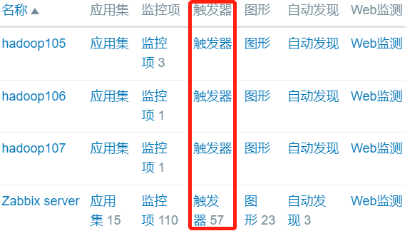 | 主机 | Host | 需要监控的网络设备,用IP或域名表示 | | 监控项 | Item | 例如:内存、CPU、硬盘、进程… | | 触发器 | Trigger | 一个被用于定义问题阈值和“评估”监控项接收到的数据的逻辑表达式 | | 动作 | Action | 一个对事件做出反应的预定义的操作,例如:邮件通知 |