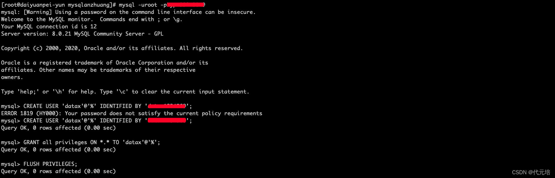 CREATE USER 'datax'@'%' IDENTIFIED BY 'dataX123456@';?// 创建账号以及密码