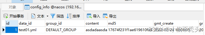 ?查看nacos数据库脚本里面的config_info表,是否有新建的这条配置