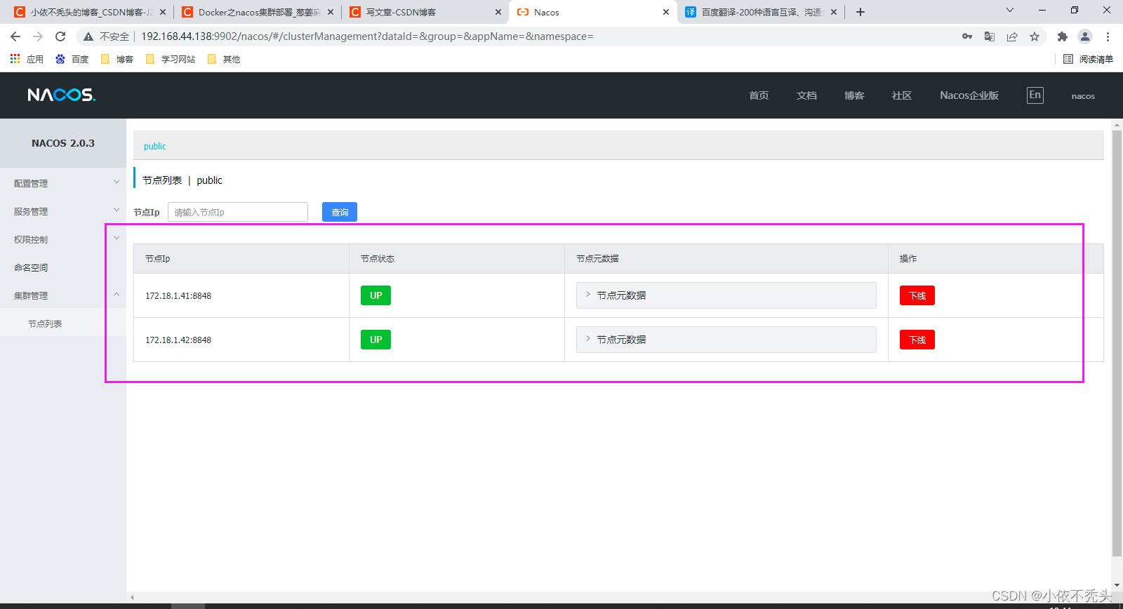 docker run -itd \ -e PREFER_HOST_MODE=ip \ -e MODE=cluster \ -e NACOS_SERVERS="172.18.1.41:8848" \ -e SPRING_DATASOURCE_PLATFORM=mysql \ -e MYSQL_SERVICE_HOST=172.18.1.30 \ -e MYSQL_SERVICE_PORT=3306 \ -e MYSQL_SERVICE_DB_NAME=nacos \ -e MYSQL_SERVICE_USER=root \ -e MYSQL_SERVICE_PASSWORD=123456 \ -p 9902:8848 \ --name nacos02 \ --net mynet \ --ip 172.18.1.42 \ --restart=always \ nacos/nacos-server?