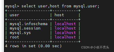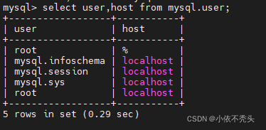 ?*注:这里的%代表的是任意机器都能通过root来远程链接到服务器,我们可以直接删除掉这个用户重新定义用户和密码。