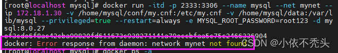 docker run -itd -p 2333:3306 --name mysql --net mynet --ip 172.18.1.30 ?-v /home/mysql/conf/my.cnf:/etc/my.cnf -v /home/mysql/data:/var/lib/mysql --privileged=true --restart=always -e MYSQL_ROOT_PASSWORD=root123 -d mysql:8.0.27