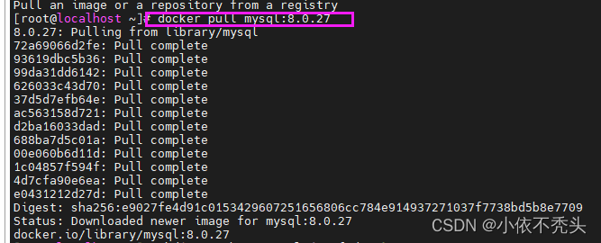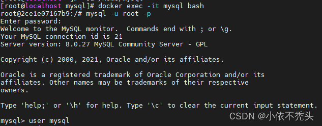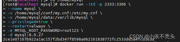 docker run -itd -p 2333:3306 \ --name mysql \ --net cd451d6d1acb --ip 172.18.1.30 \ -v /home/mysql/conf/my.cnf:/etc/my.cnf \ -v /home/mysql/data:/var/lib/mysql \ --privileged=true \ --restart=always \ -e MYSQL_ROOT_PASSWORD=root123 \ -d mysql:8.0.27