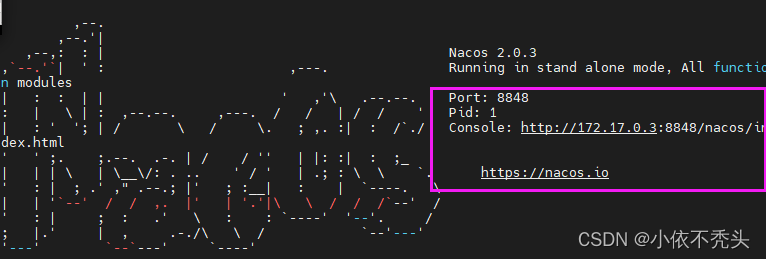 docker run -it \ -e PREFER_HOST_MODE=ip \ -e MODE=standalone \ -e SPRING_DATASOURCE_PLATFORM=mysql \ -e MYSQL_SERVICE_HOST=172.17.0.2 \ -e MYSQL_SERVICE_PORT=3306 \ -e MYSQL_SERVICE_DB_NAME=nacos \ -e MYSQL_SERVICE_USER=root \ -e MYSQL_SERVICE_PASSWORD=123456?\ -p 9901:8848 \ --name nacos?\ --restart=always \ nacos/nacos-server?